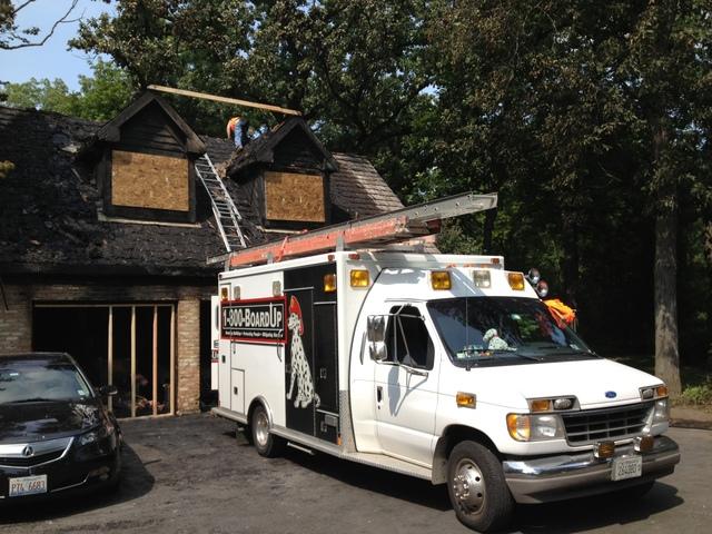 Even a detached garage is important to board-up after an extreme fire. This garage in Long Grove, IL caught on fire after one of the cars exploded inside.